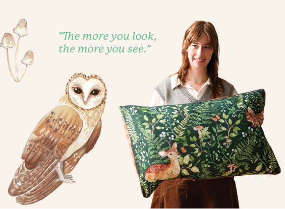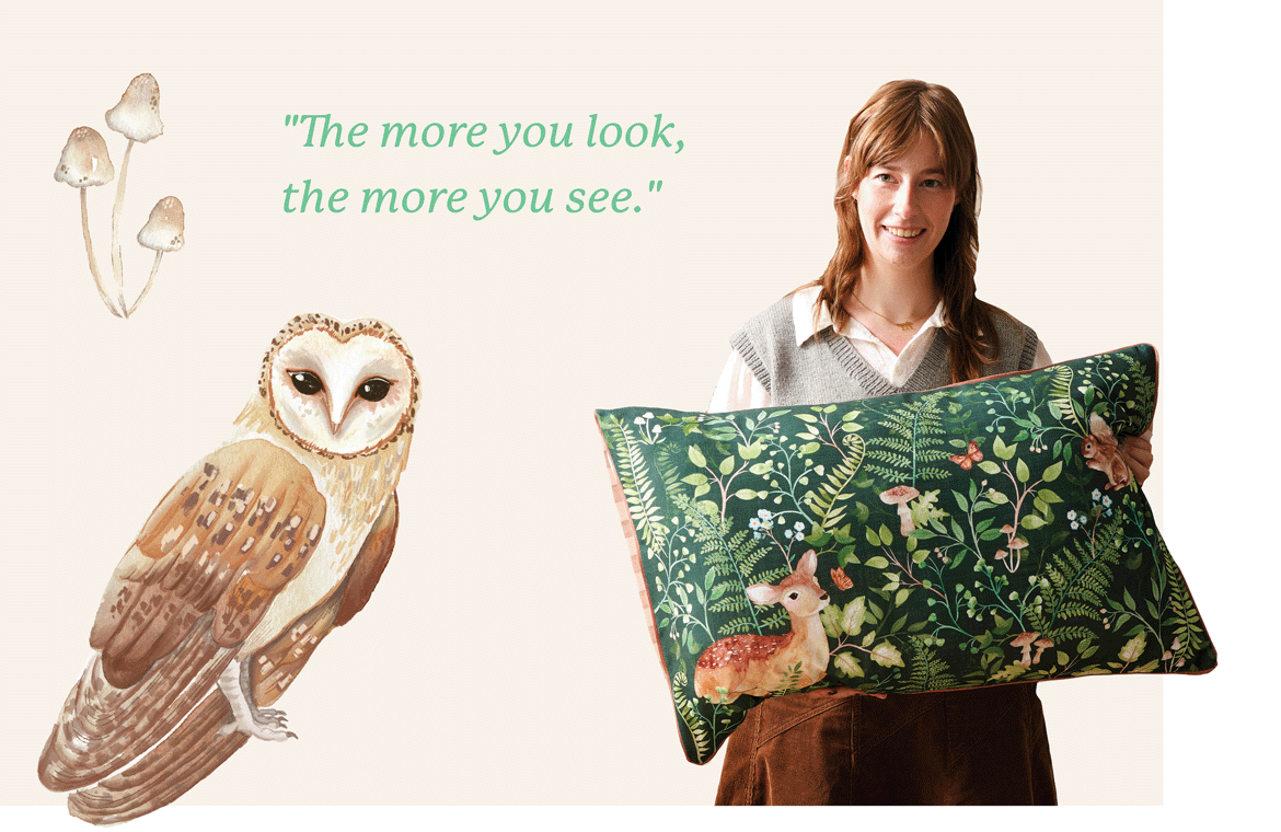 One of my favourite aspects of this design is how much is hidden behind the ferns and leaves. The more you look, the more you see. There are lots of little mushrooms, butterflies, and hedgehogs waiting to be found. I think that it’s these small details that make a design really special.