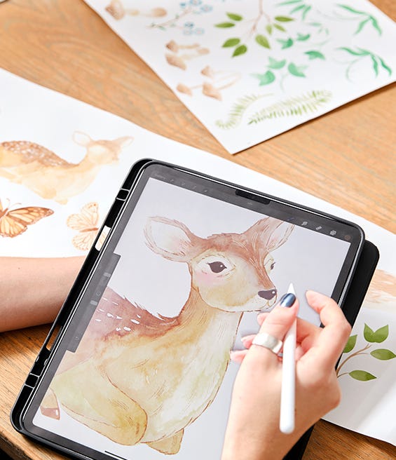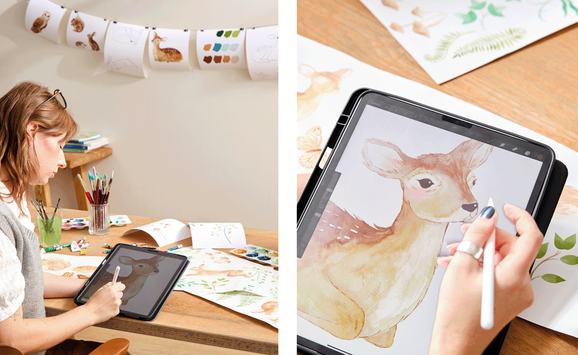 I began by collecting lots of nature photography of animals, ferns, and forest foliage for inspiration. I then made a bunch of initial sketches before transferring my favourites to watercolour paper. For the animals I used watercolour paints in warm grey and soft neutral browns, and olive green for the ferns and leaves. Once the paint dried, I scanned up all the artwork and made some final adjustments on my iPad. After that, it was all put together on the computer to create a lush forest scene with lots of sweet animals amongst the ferns.