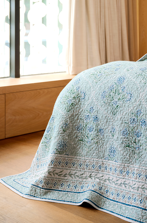 Cool and calm ocean blues create a tranquil bedroom style. Subtle stitched detailing adds comfort and sophistication.