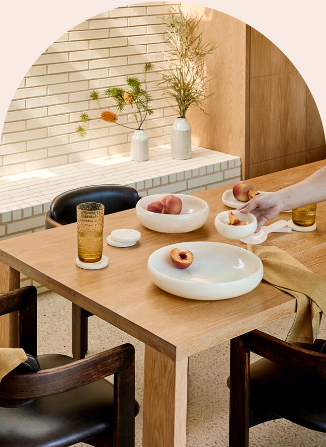 Create a space that feels calm and relaxed. Organic forms and shades pulled from nature come together for a warm and inviting aesthetic.